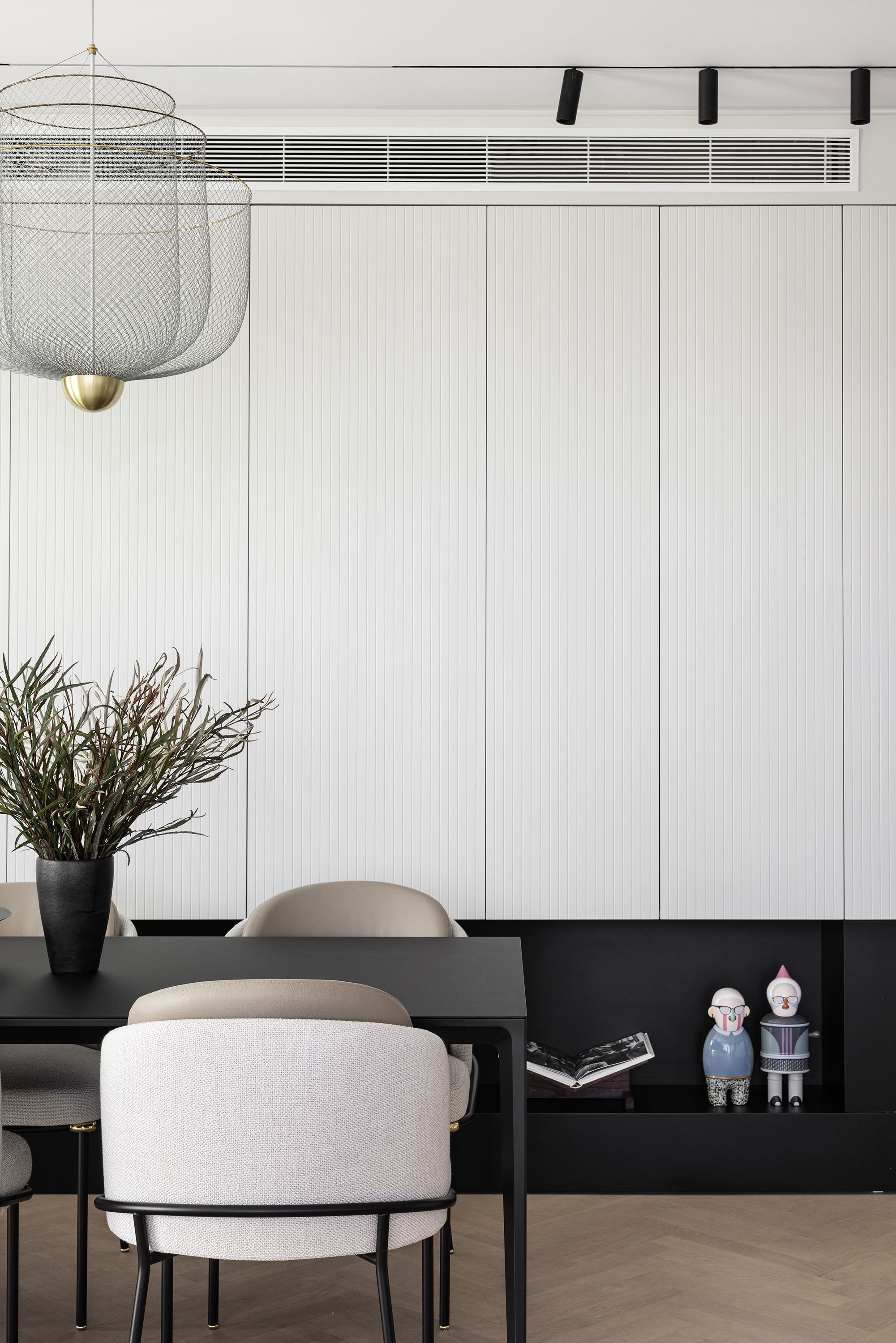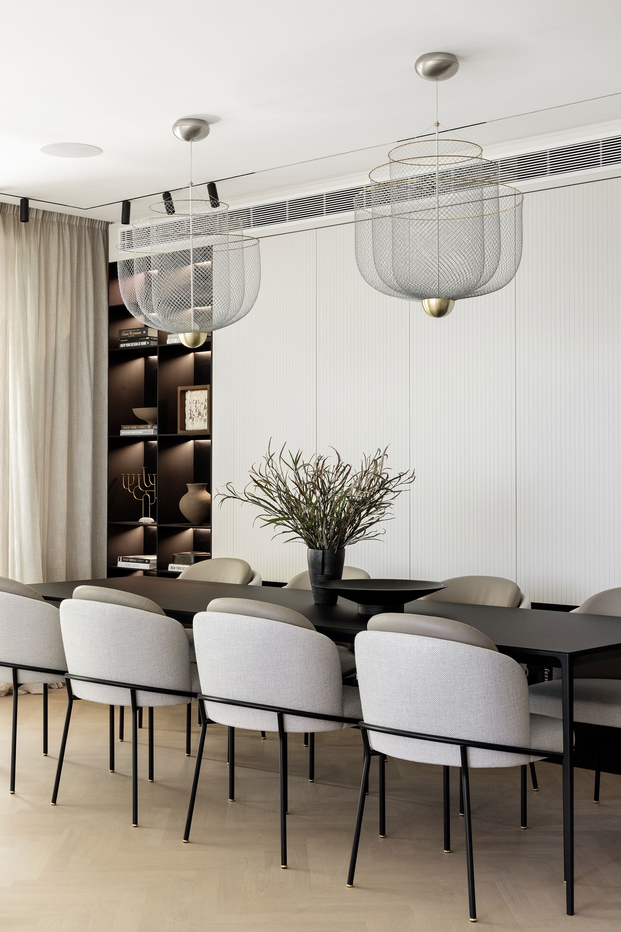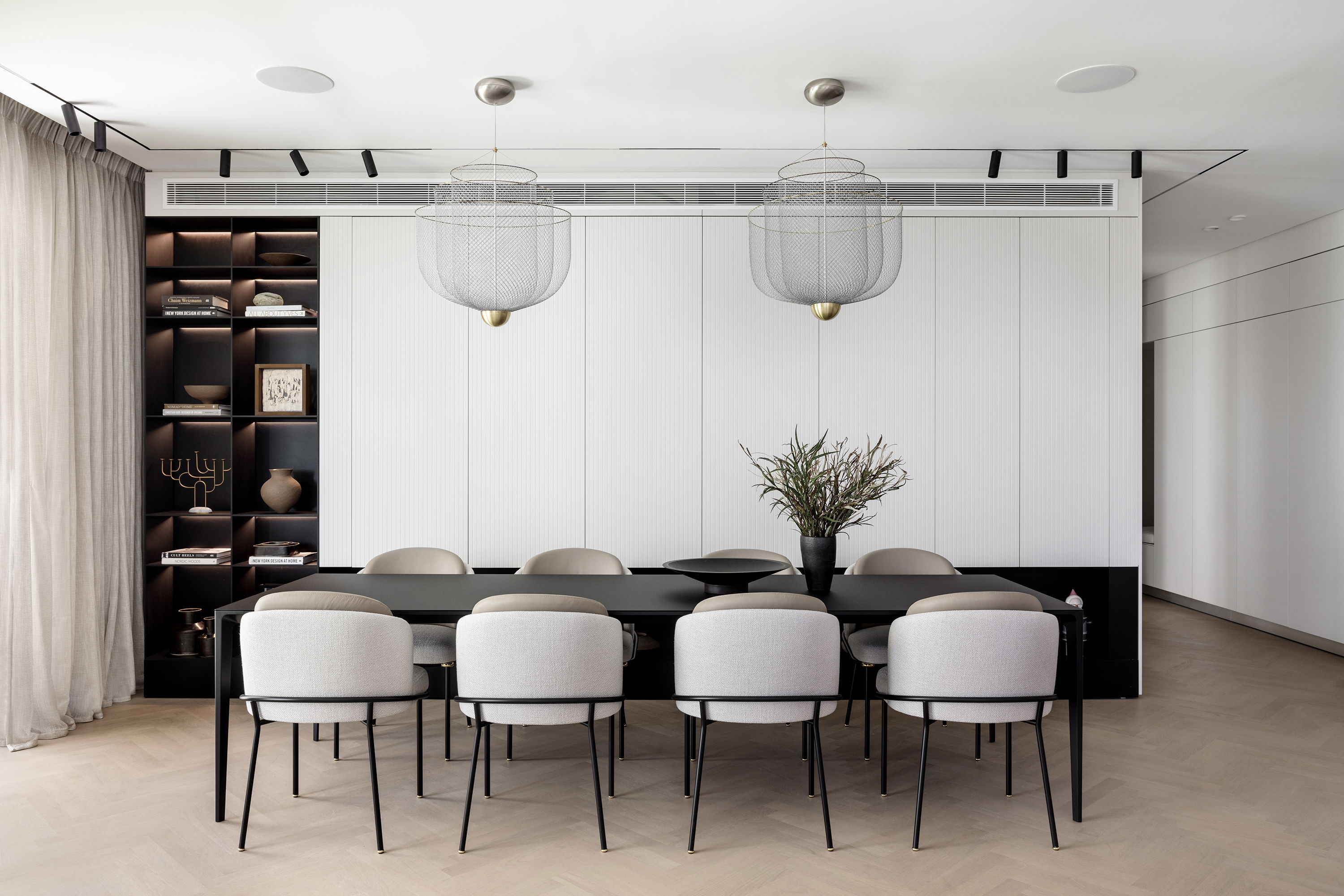 בלב האזור הציבורי תוכנן ארון תצוגה ואחסון מקיר לקיר: חזיתות שלייפלק מחורצות, נישות פתוחות בשחור, ותאורת לד שמדגישה כל פריט ומעניקה עומק וחום. הקיר כולו הופך לרקע אלגנטי לפינת האוכל: נקי, מאורגן, מלא נוכחות. מסוג הקירות שמגדירים חלל שלם :)