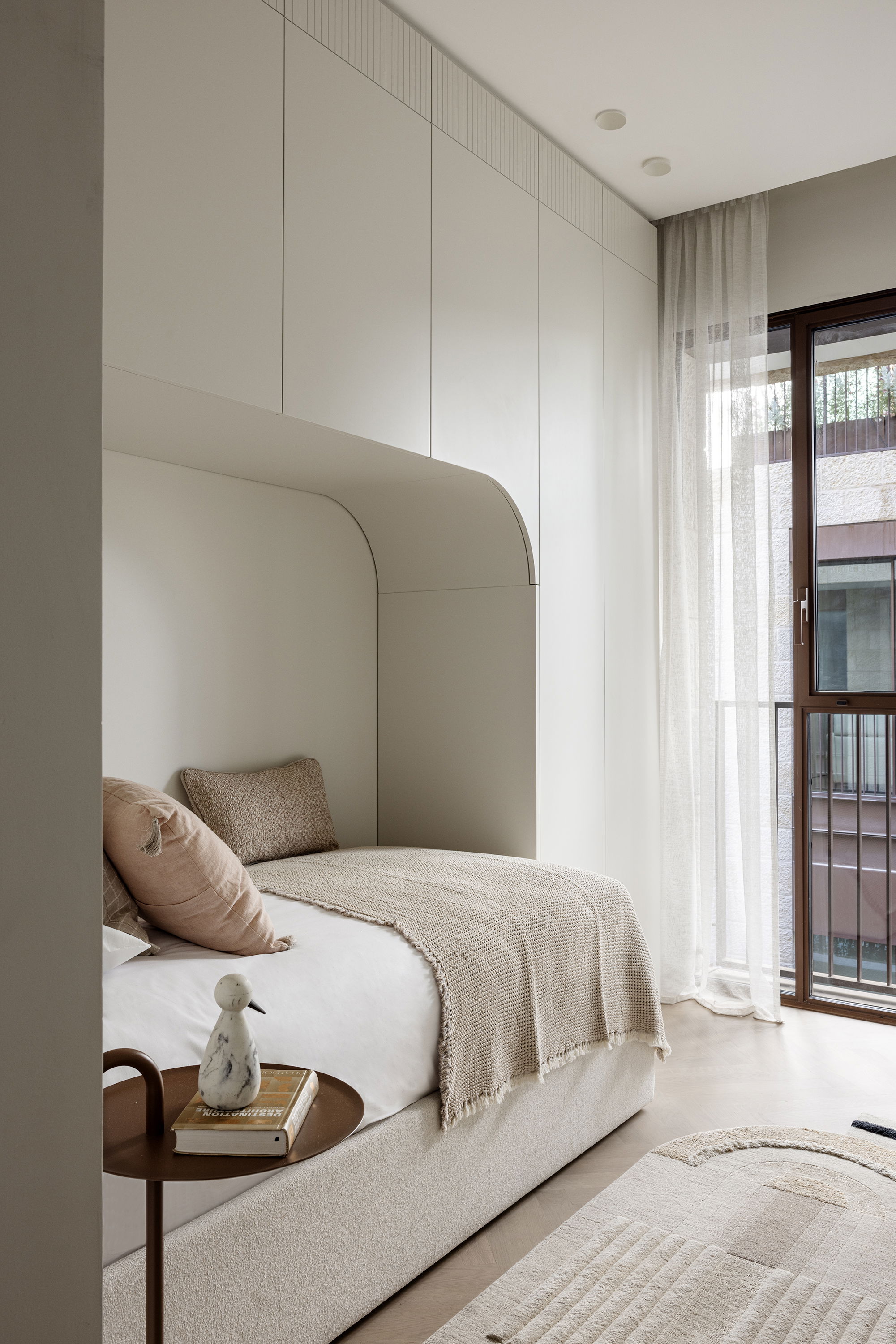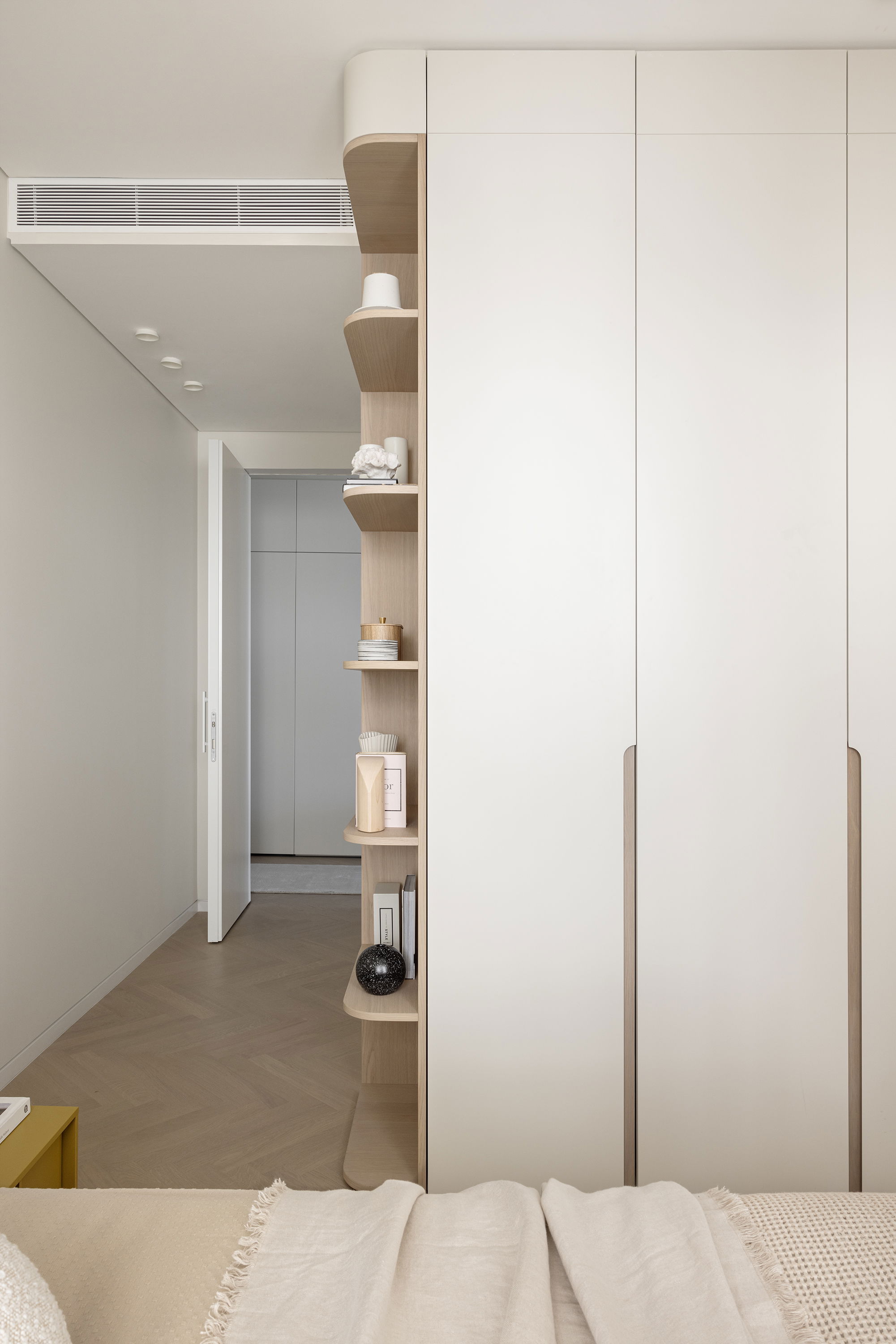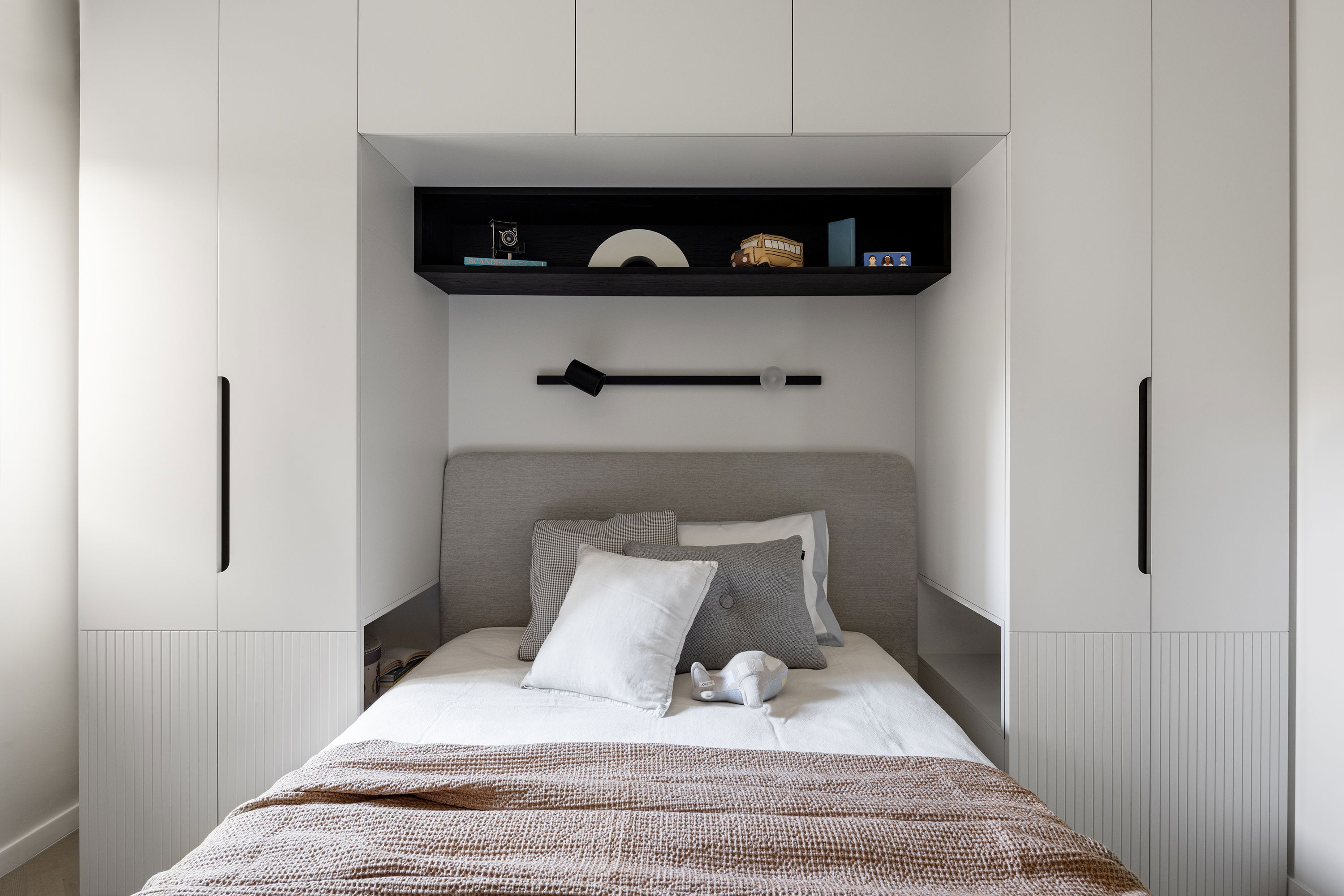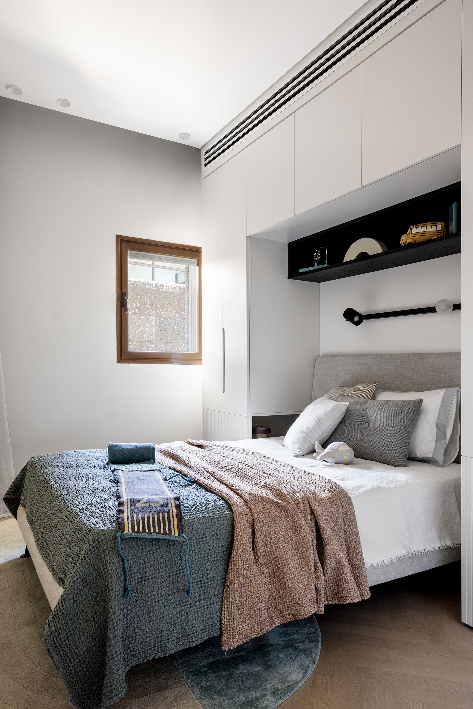 בשני חדרי הילדים יש רגעים קטנים של עיצוב מדויק: ארונות אינטגרליים שנפתחים לנישות שימושיות, טוויסטים מעוגלים שמרככים את הגאומטריה, וחיפויי קיר שממשיכים לתוך אזור המיטה ליצירת מסגרת חמימה. הטיפול בפרטים העדינים יוצר חללים שלווים ונעימים, עם תכנון פונקציונלי שעובד מעולה ביום-יום.