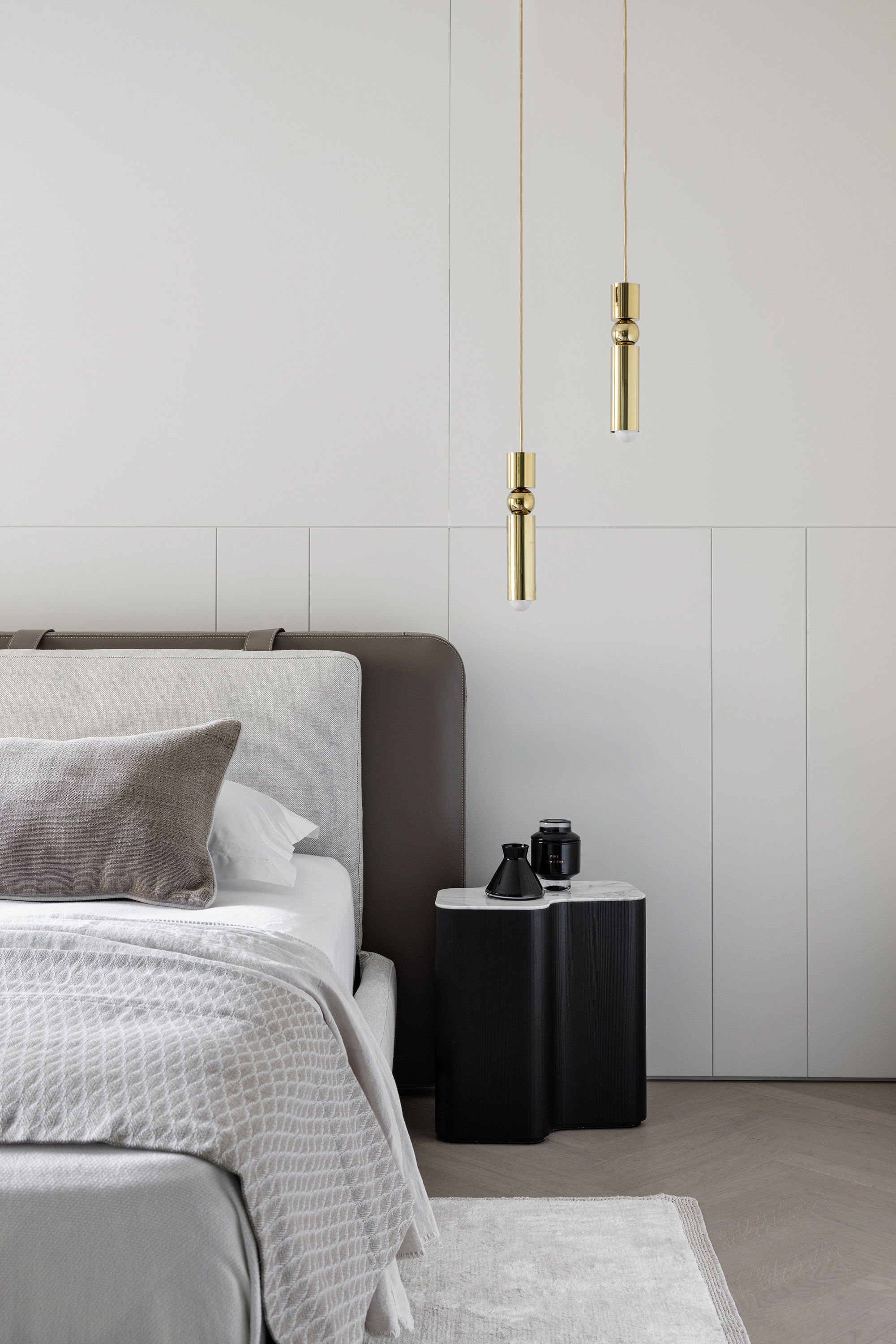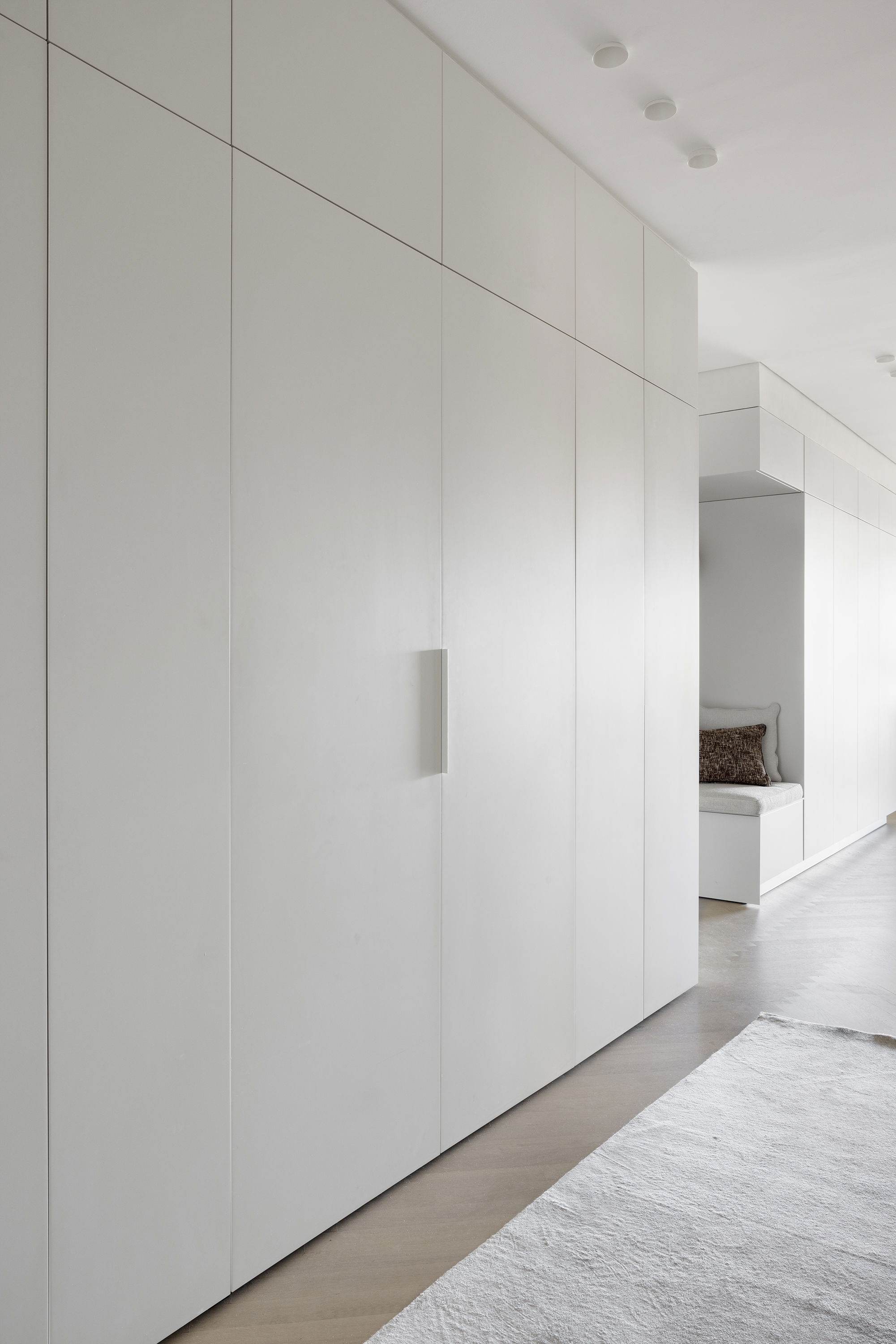 חיפוי הקיר בסוויטה נמשך לכל אורך החדר: סביב המיטה, מעליה, ובמפגש עם ארונות האחסון. השילוב בין חזיתות חלקות לחזיתות מחורצות יוצר קצב עדין ומדוד, ותאורת התליה המוזהבת משתלבת בצורה מדויקת בתוך השפה החומרית. פינת האיפור משלימה את התמונה: קלה, בהירה, מרחפת, וממשיכה את אותו קו נקי ואחיד.