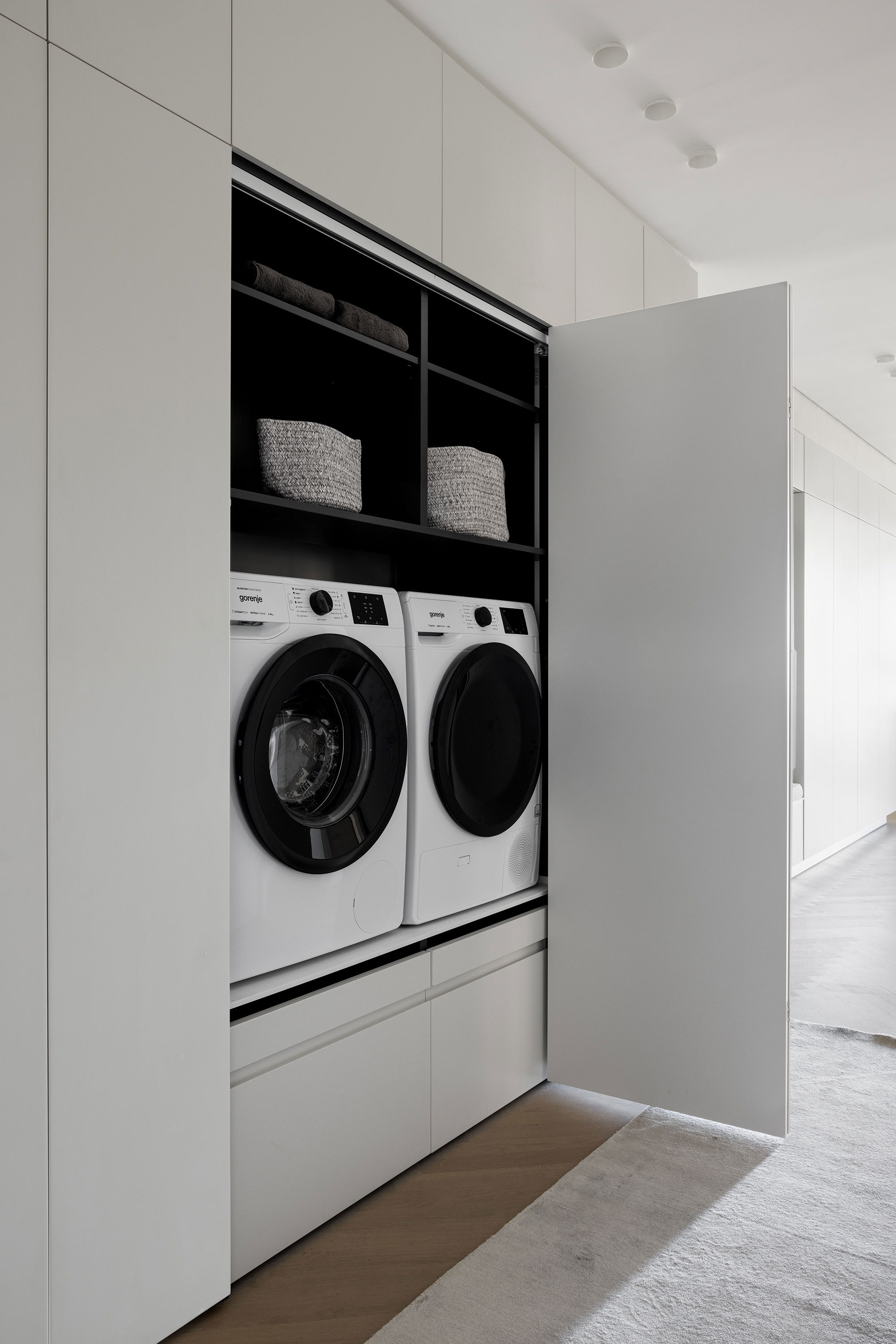 מאחורי חזית חלקה מסתתרת יחידת שירות מתוכננת להפליא - מכונות כביסה, מדפים שחורים לאחסון, וסדר שמאפשר לחלל הציבורי להישאר שקט ונקי. זה בדיוק המקום שבו נגרות טובה עושה את ההבדל בין “בית יפה” ל“בית נוח”.