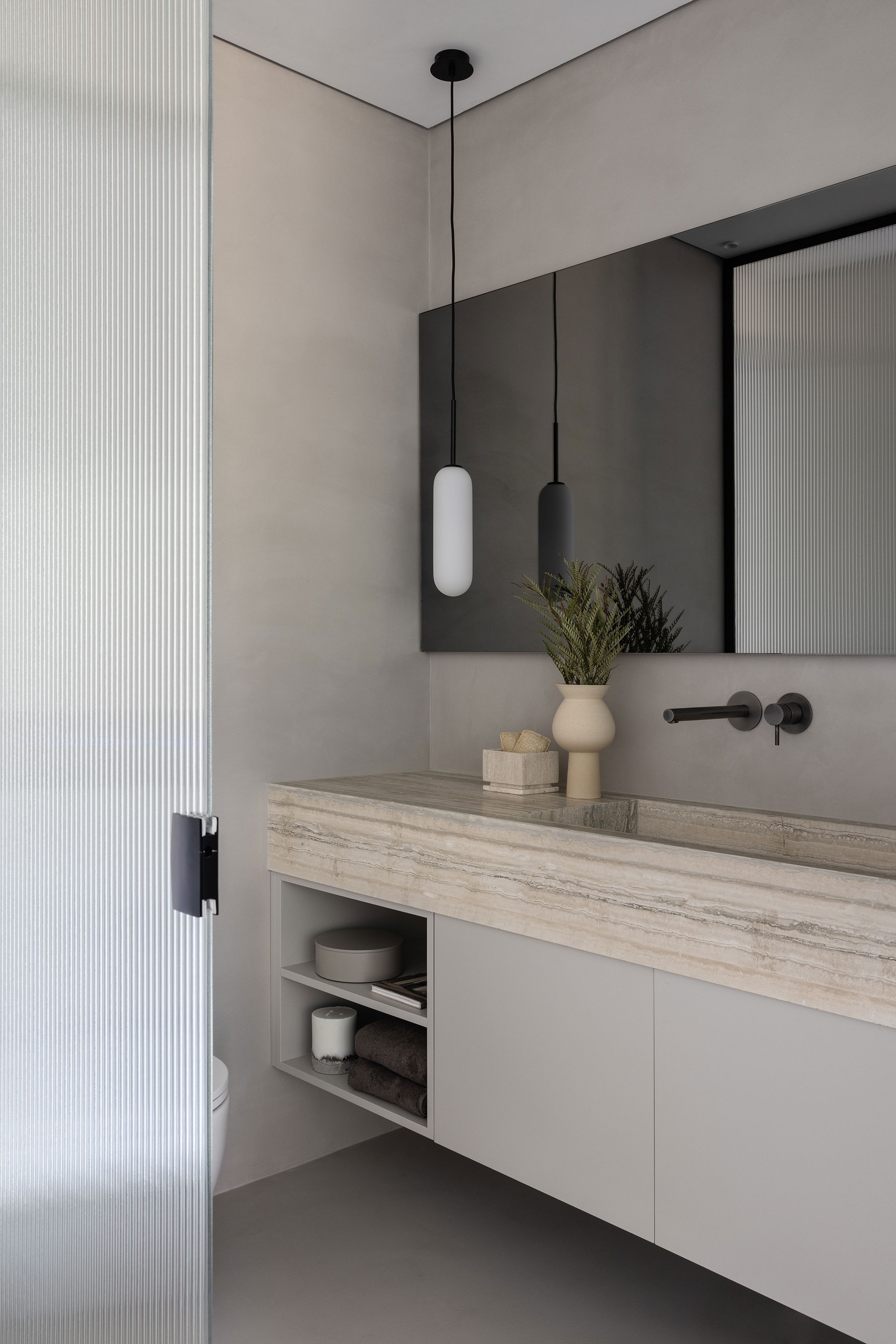 ארון הכיור בנוי בגימור חלק ובהיר, עם משטח אבן טבעית שממשיך בצורה מלאה אל הכיור השקוע. נישה פתוחה ונקייה משלימה את הפונקציונליות, והדלת המחורצת מזכוכית מאפשרת מצד אחד פרטיות, ומצד שני אור טבעי.
