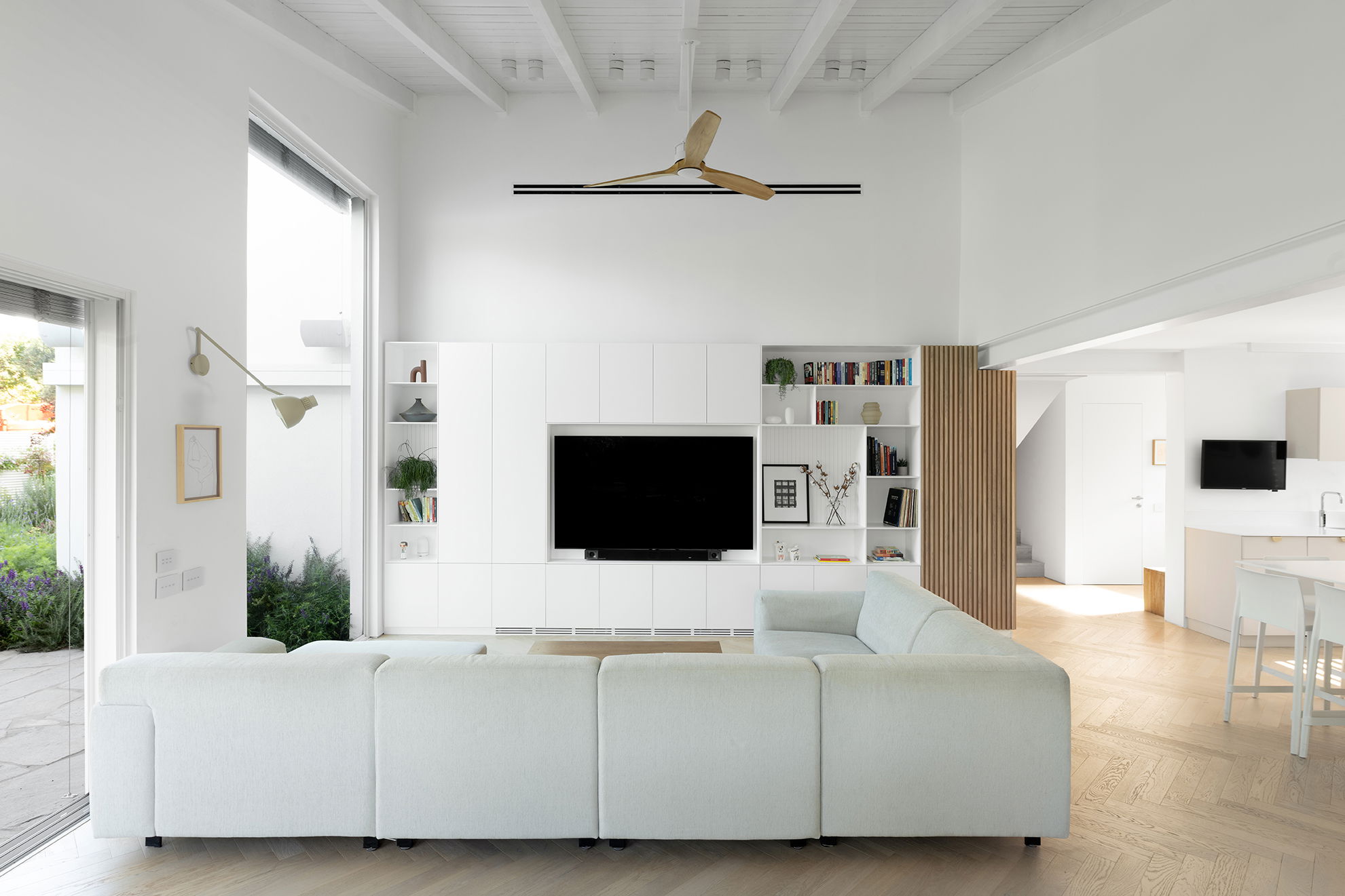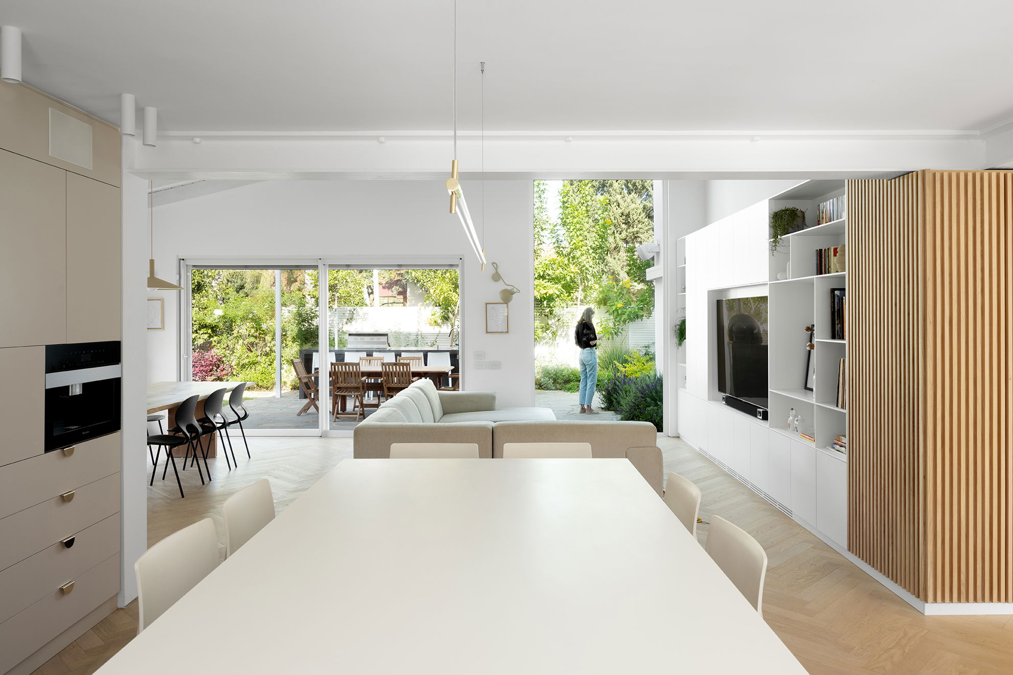 בבית קרקע רחב ידיים, שתוכנן כמרחב פתוח ומואר, הנגרות אינה רק אלמנט פונקציונלי - אלא חלק בלתי נפרד מהאדריכלות עצמה. החלל מפנה מקום לאור, והנגרות ממשיכה את הקו הזה בדיוק. קיר הטלוויזיה תוכנן כמסה נקייה ובהירה, המשלבת אחסון סגור לצד אזורי תצוגה פתוחים. חיפוי סרגלי האלון, שמתחיל כבר באזור הכניסה וממשיך אל הסלון, מייצר רצף חומרי ושפה אחידה בחלל. הוא מוסיף עומק ועניין, אך שומר על קצב עדין שלא מפר את השקט הוויזואלי. התוצאה היא קיר נגרות שמצליח להיות נוכח - אך לא דומיננטי, ומאפשר לאור ולחלל להוביל.