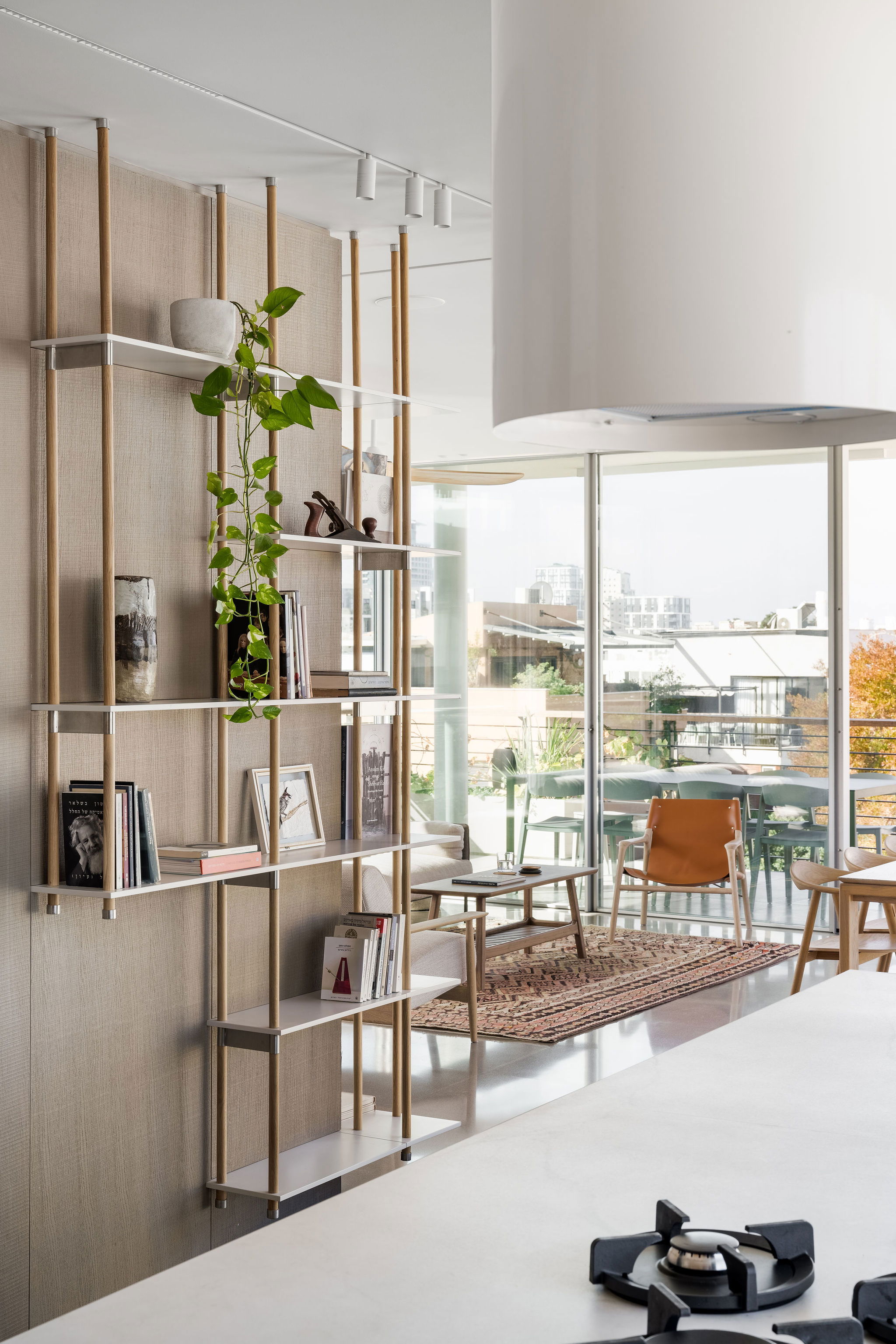 בפרויקטים שבהם נדרשת כמות גדולה של אחסון ותצוגה, האתגר הוא לשמור על תחושת קלילות. כאן, הפתרון הגיע דרך נגרות שמוותרת על המסה המסורתית - ובוחרת לרחף. הספריה, שמתחילה מאמצע קיר הסלון וממשיכה לעטוף את הפינה אל עבר המסדרון, נתלית מהתקרה ואינה נוגעת ברצפה. מוטות אלון ומחברי נירוסטה דקים יוצרים קונסטרוקציה עדינה אך מדויקת, שמשלבת בין יציבות לאווריריות. השילוב בין מדפים לבנים, אלון מגוון ופרטים מחומרים שונים - מייצר עניין ויזואלי עשיר, תוך שמירה על שקיפות ותחושת תנועה במרחב. כך מתקבלת ספריה שמצליחה להכיל הרבה - מבלי להכביד.