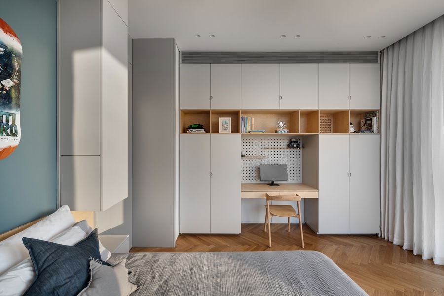 האביב מביא איתו גם צורך טבעי בארגון מחדש - ובנגרות, זה המקום שבו פונקציה ואסתטיקה נפגשות בצורה המדויקת ביותר. בחדר הילדים הזה תוכננה יחידת נגרות שמשלבת בין אחסון, תצוגה ופינת עבודה, לכדי מערכת אחת שלמה. ארונות בגמר צבע יוצרים מעטפת אחידה ונקייה, שבתוכה נפתחת נישה חמה באלון, הכוללת שולחן עבודה ולוח פג בורד פונקציונלי. החלוקה הברורה בין סגור לפתוח מאפשרת לשמור על סדר ויזואלי, גם כשהשימוש היומיומי אינטנסיבי. כל פריט מקבל את המקום שלו - מבלי לפגוע בשקט של החלל. זו נגרות שמבינה את החיים עצמם - ויודעת לארגן אותם מחדש.
